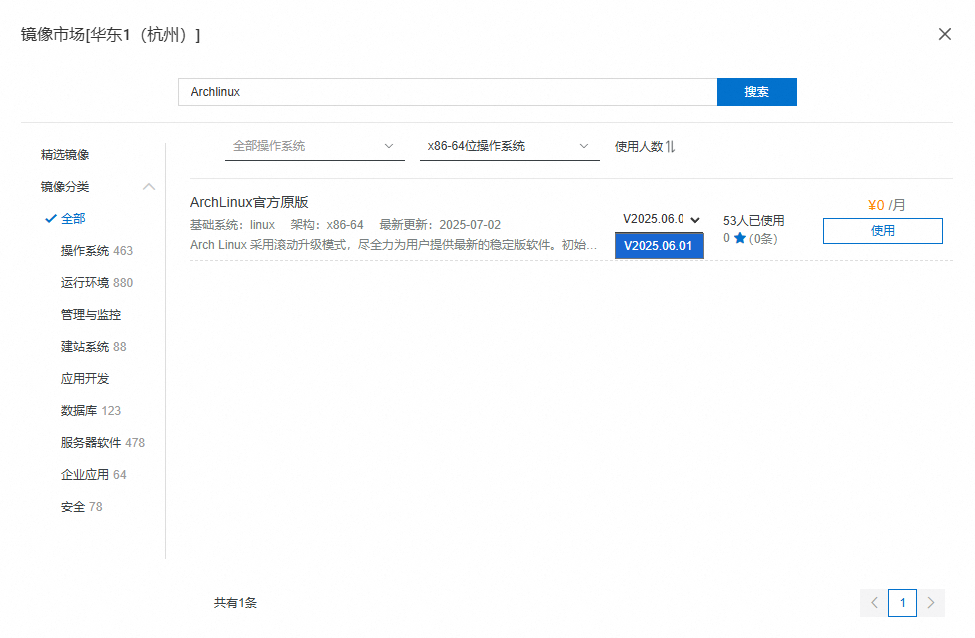 另外写到这里,本来想锐评一下阿里云在内的国内云服务器厂商不提供Arch Linux镜像这件事的,但是我突然发现其实他们是提供的——这真是没有想到。阿里云的镜像市场里确实有archlinux镜像(虽然版本有点落后),这下压力来到了Azure的一边(